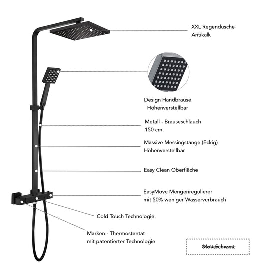 Designer Duschsäule Serie "Park" Höhenverstellbar mit Regendusche, Thermostat und Handbrause schwarz