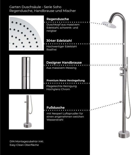 Designer Garten Duschsäule Serie SOHO mit Regendusche und Handbrause aus Edelstahl Gartendusche