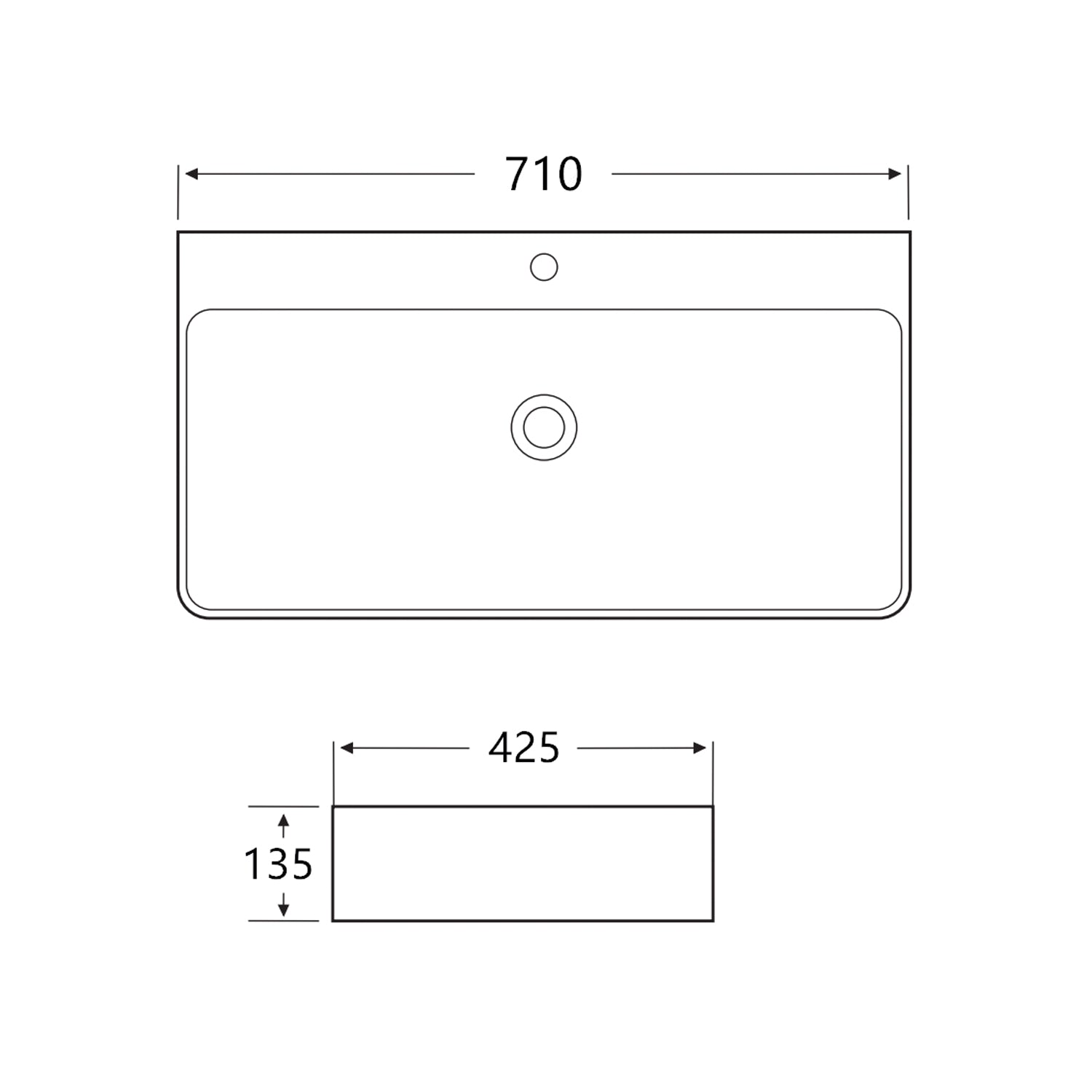 Das Waschbecken ist 70 cm breit, 42,5 cm tief und 13,5 cm hoch. Im Lieferumfang ist nur das Keramikwaschbecken enthalten. Die Waschtischarmatur, das Popup-Ventil und das Befestigungsmaterial sind optional zu wählen.