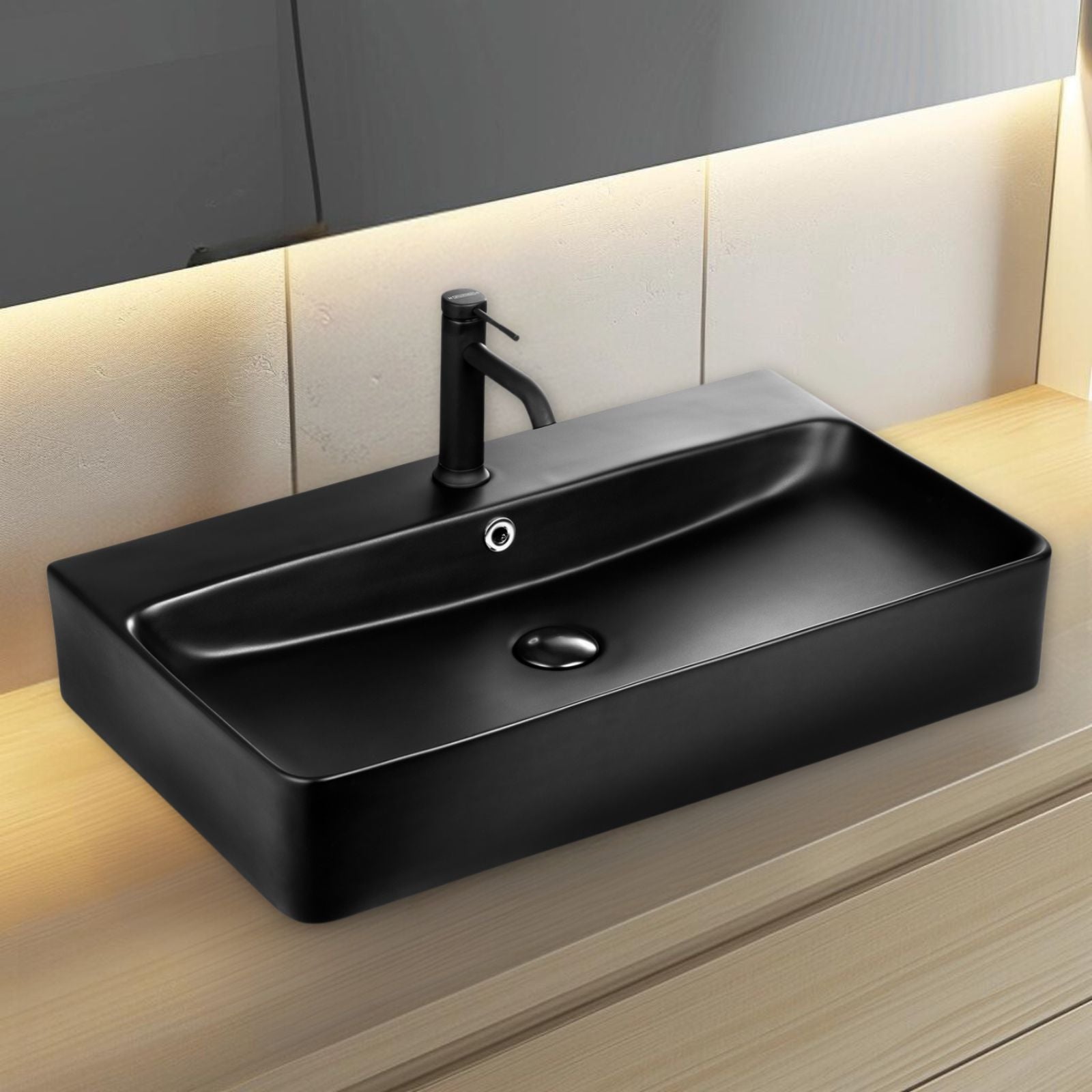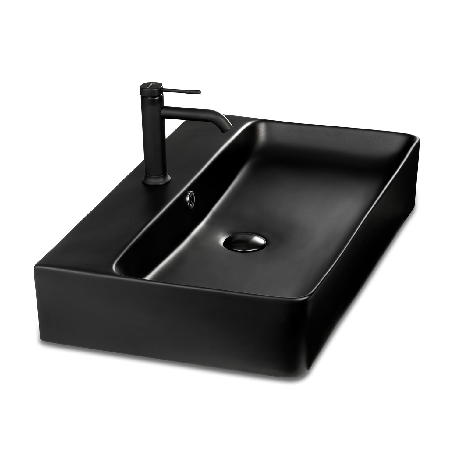 Berlin Waschbecken 70x42 aus feinster Keramik für Wandmontage oder als Aufsatzwaschbecken mit Hahnloch in Schwarz Matt