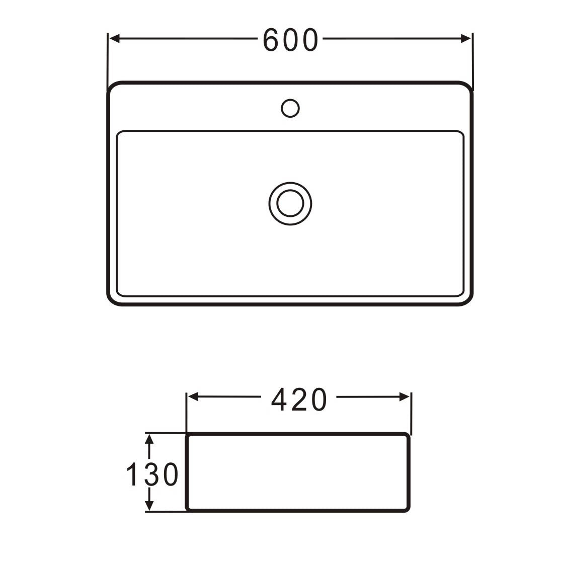 Das Waschbecken ist 60 cm breit, 42 cm tief und 13 cm hoch. Im Lieferumfang ist nur das Keramikwaschbecken enthalten. Die Waschtischarmatur, das Popup-Ventil und das Befestigungsmaterial sind optional zu wählen.
