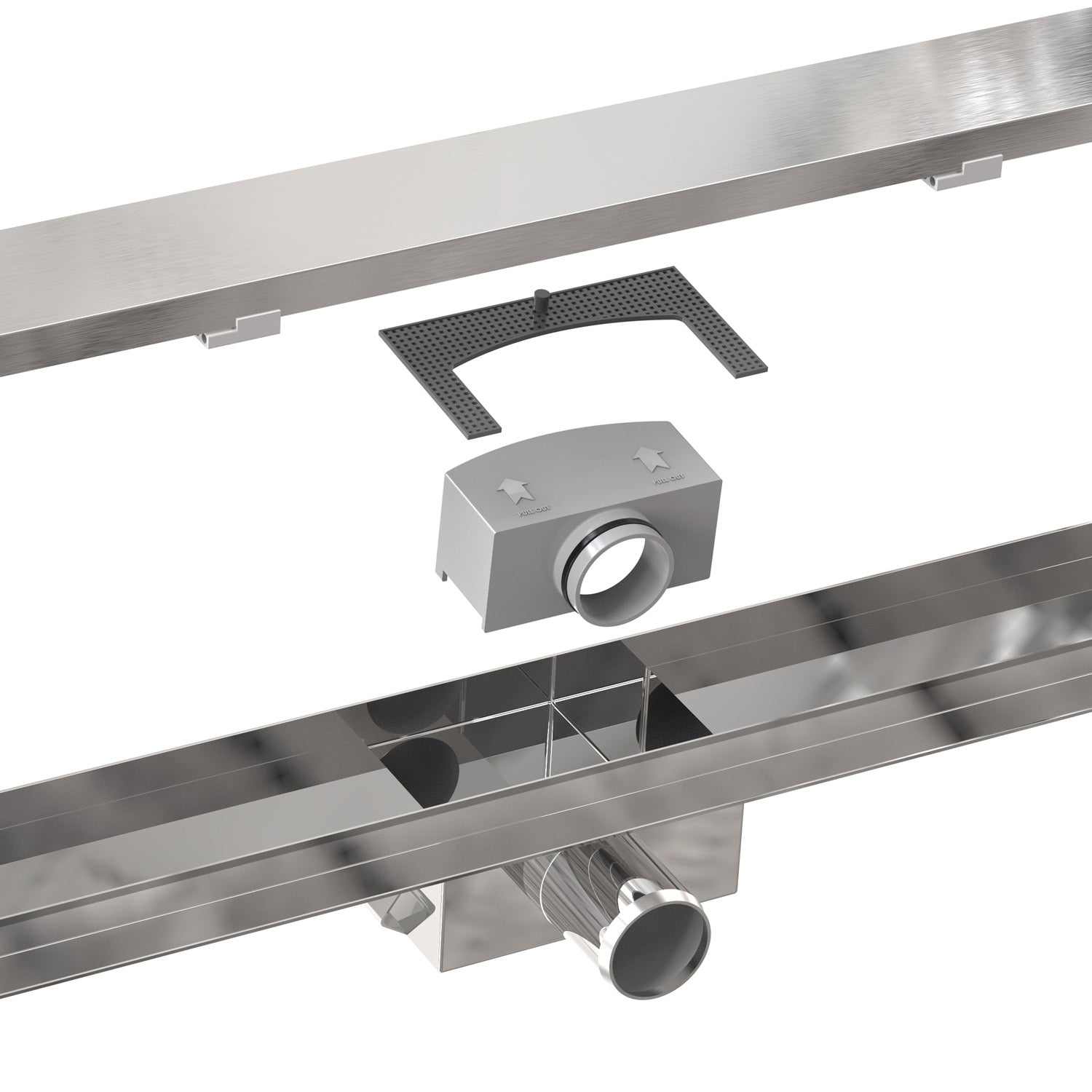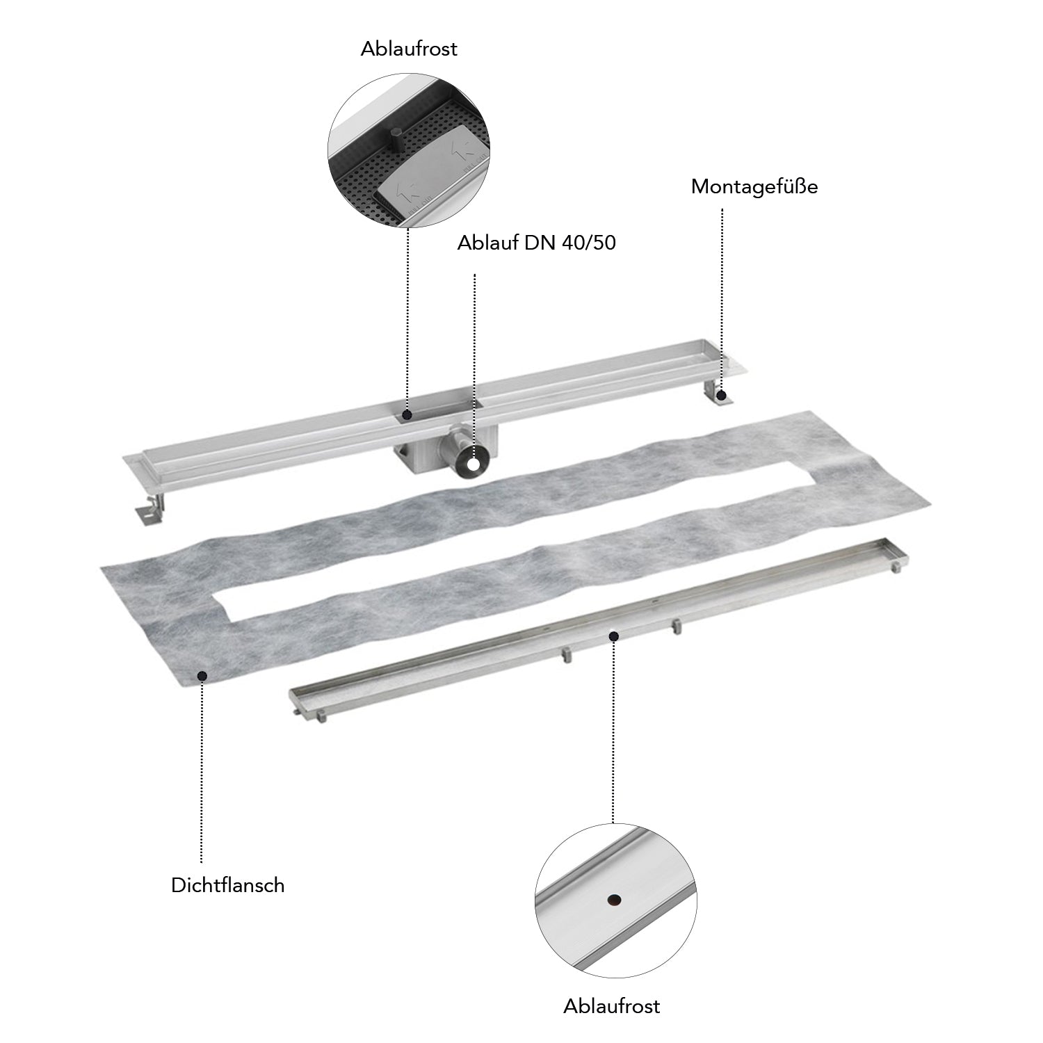 - Entnehmbarer Haarfang-Sieb, befliesbarer Ablaufrost und ein entnehmbarer Siphon bieten Anwenderfreundlichkeit und ein sauberes Ablaufsystem.