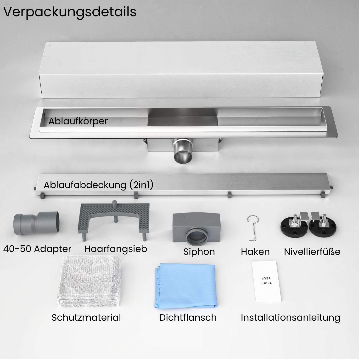 - Eine einwandfreie Verarbeitung und Oberflächenversiegelung, eine geringe Einbautiefe und der beiliegende Fliesenflansch für eine perfekte Abdichtung runden das Premiumangebot ab.